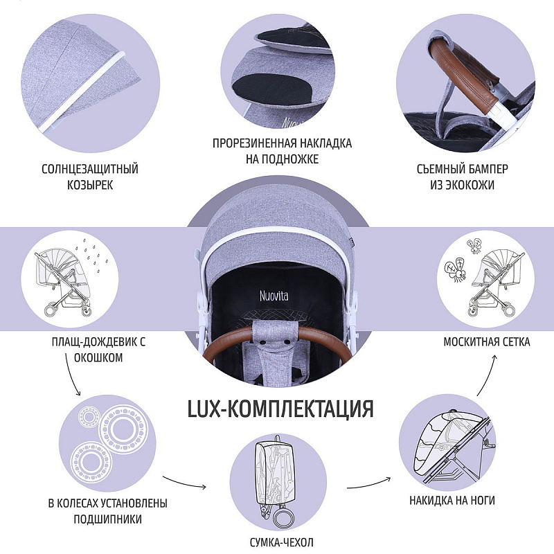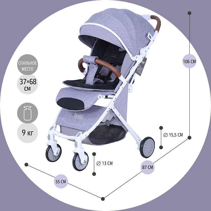 Модель Nuovita Giro Lux— это просторная прогулочная коляска, рассчитанная на детский возраст от 6 месяцев до 3-х лет. Прекрасно подойдет для путешествий на самолете, поезде и повседневных прогулок, в том числе и в зимний сезон, поскольку сидение коляски способно вместить малыша, одетого в теплый комбинезон. Легко и беспрепятственно проходит в любой лифт. Прогулочная коляска обладает рядом полезных функций и занимает совсем немного места. Материал обивки — плотная практичная ткань 300D лён, которая обработана специальной пропиткой, в результате чего не пропускает ветер и влагу, устойчива к попаданию ультрафиолетовых лучей и легко чистится.