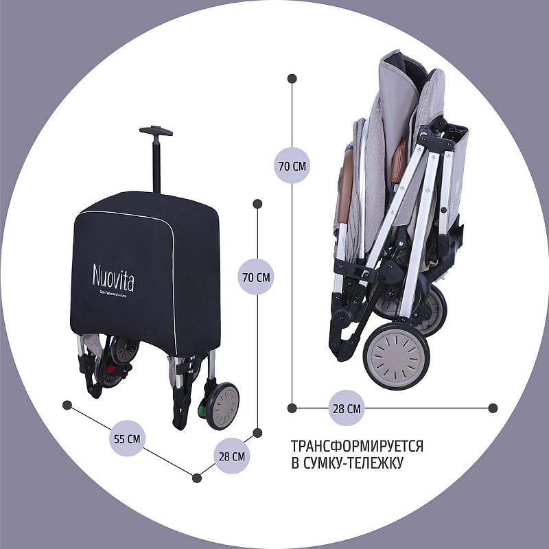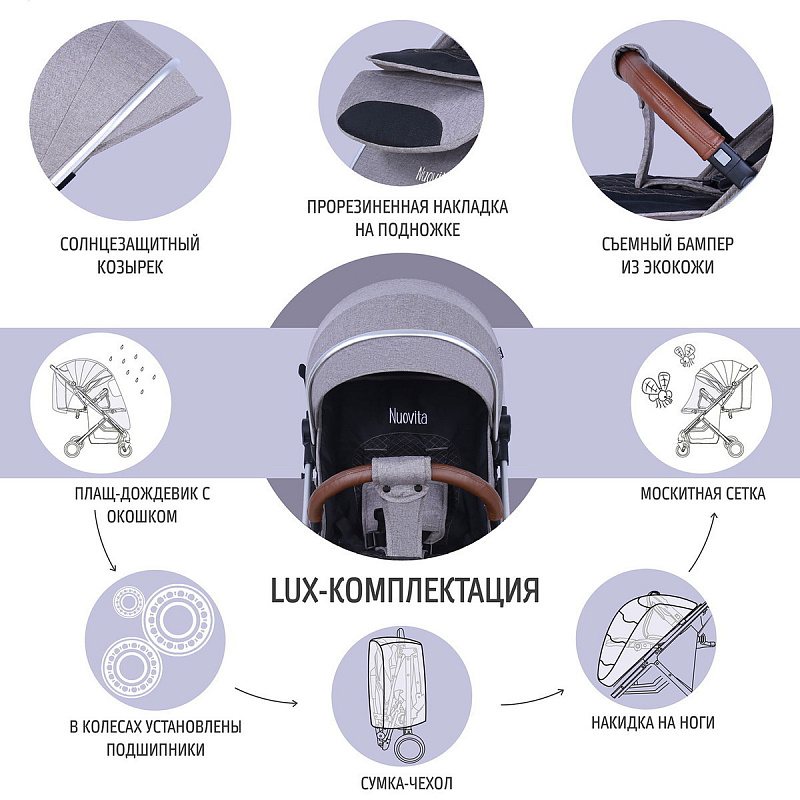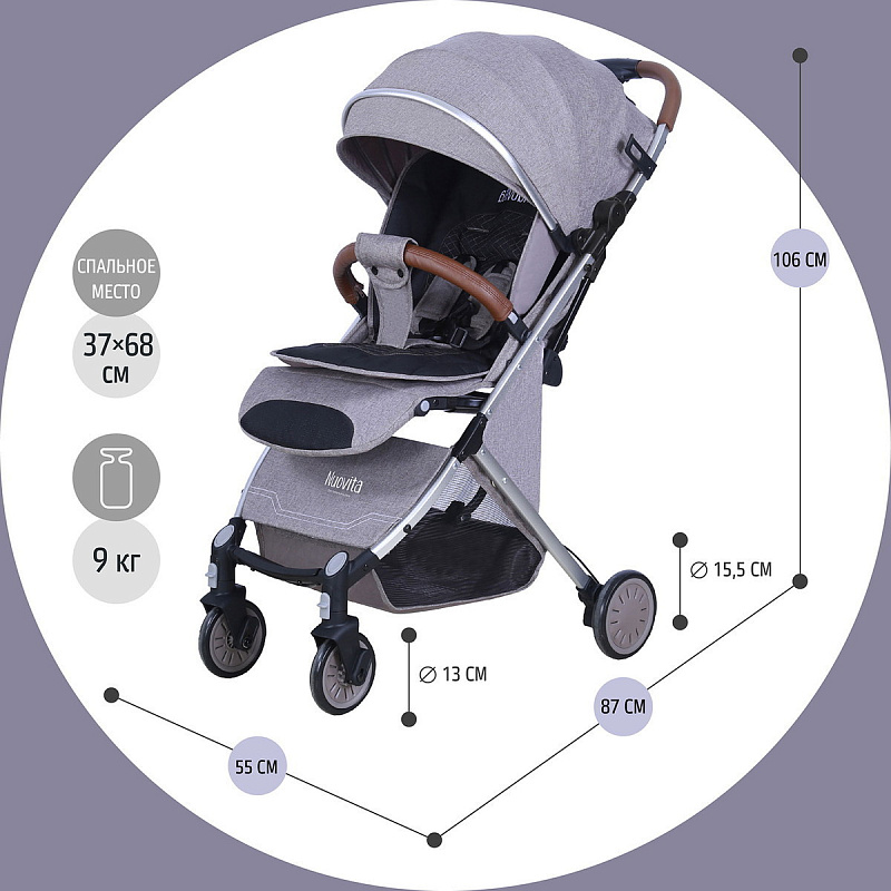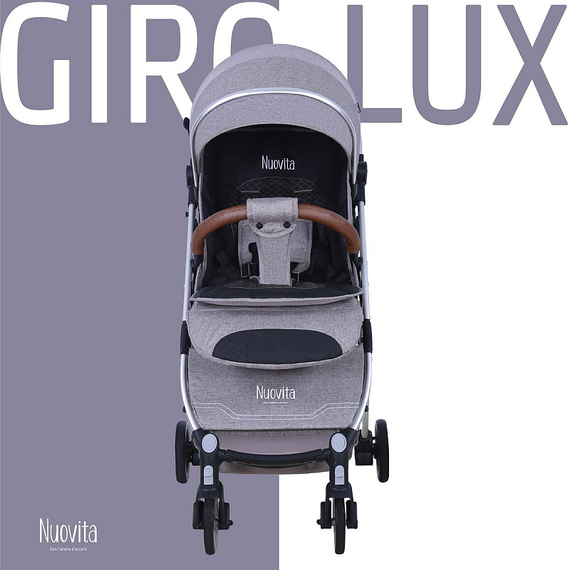 Модель Nuovita Giro Lux— это просторная прогулочная коляска, рассчитанная на детский возраст от 6 месяцев до 3-х лет. Прекрасно подойдет для путешествий на самолете, поезде и повседневных прогулок, в том числе и в зимний сезон, поскольку сидение коляски способно вместить малыша, одетого в теплый комбинезон. Легко и беспрепятственно проходит в любой лифт. Прогулочная коляска обладает рядом полезных функций и занимает совсем немного места. Материал обивки — плотная практичная ткань 300D лён, которая обработана специальной пропиткой, в результате чего не пропускает ветер и влагу, устойчива к попаданию ультрафиолетовых лучей и легко чистится.