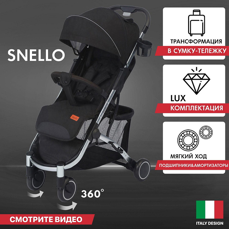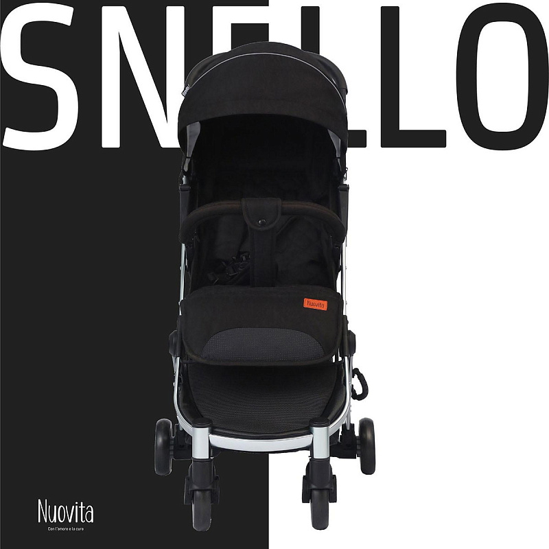 Nuovita Snello — одна из самых прочных, вместительных и красивых колясок-книжек бренда Nuovita, предназначенных для прогулок с детьми в возрасте от полугода до 3-х лет. Подойдет для путешествий на самолете, поезде и повседневных прогулок, в том числе и в зимний сезон, поскольку сидение коляски способно вместить малыша, одетого в теплый комбинезон. Коляска легко и беспрепятственно проходит в любой лифт. Капор бесшумно регулируется в 3-х положениях, его объем увеличивается благодаря откидному козырьку от солнца: в раскрытом состоянии капор почти полностью закрывает верхнюю часть коляски. Для вентиляции и наблюдения капор оснащен окошком. Обивка коляски изготовлена из прочной ткани 300D лен, которая предохранит от дождя и УФ-лучей, не продувается и легко чистится. Бампер и родительская ручка имеют практичные накладки из экокожи. В капор вшит светоотражающий кант. Алюминиевая рама коляски изготовлена с особым изяществом: отличительной чертой данной модели является крепление передних колес непосредственно на каркасе рамы, что делает дизайн весьма эффектным и запоминающимся. Колеса одинарные, материал покрышек представляет собой вспененную резину, что в сочетании с амортизаций обеих колесных баз обеспечивает плавный и мягкий ход.