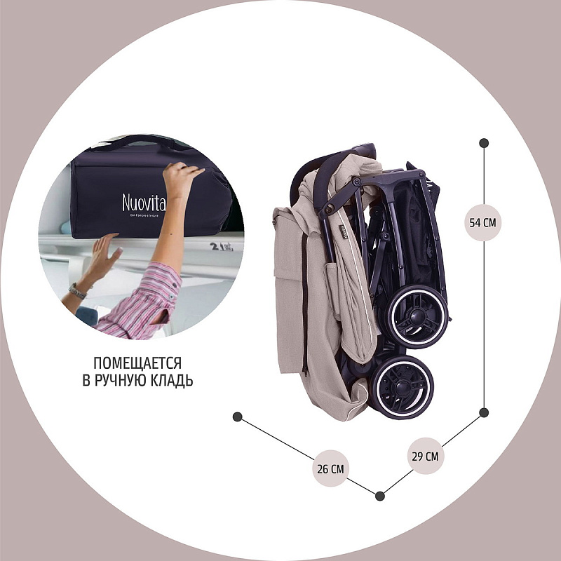 Прогулочная коляска Nuovita Vero — это классическая коляска-книжка с удобным посадочным местом для малыша в возрасте от шести месяцев до 3-х лет. Данная коляска прекрасно подойдет для путешествий на самолете и поезде. Коляску можно взять в ручную кладь, не боясь, что она потеряется или испортится при перевозке в багажном отделении. Модель легко и беспрепятственно проходит в любой лифт. Для надежной фиксации малыша на сидении предусмотрены 5-точечные ремни безопасности с мягкими накладками, межножный ограничитель и защитный съемный бампер с накладкой из текстиля. Коляска имеет удобный капор, который бесшумно регулируется двумя положениями и имеет дополнительный козырек от солнца. Обивка изготовлена из специальной влаго- и ветроустойчивой ткани. Это 300D лен — материал с пропиткой, которая создает защиту от намокания и выцветания, а также легко поддается очистке. Родительская ручка имеет мягкую накладку из поролона. Рама выполнена из алюминия, имеет классическую конструкцию и снабжена двойными колесами с амортизацией. На раме задних колес расположена педаль ножной тормозной системы. Материал покрышек — вспененная резина, что в комплекте с полной амортизацией обеих колесных баз обеспечивает плавный ход даже на ухабистой дороге.