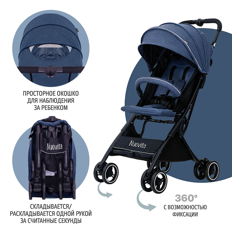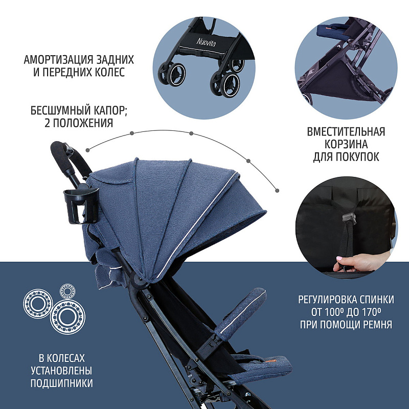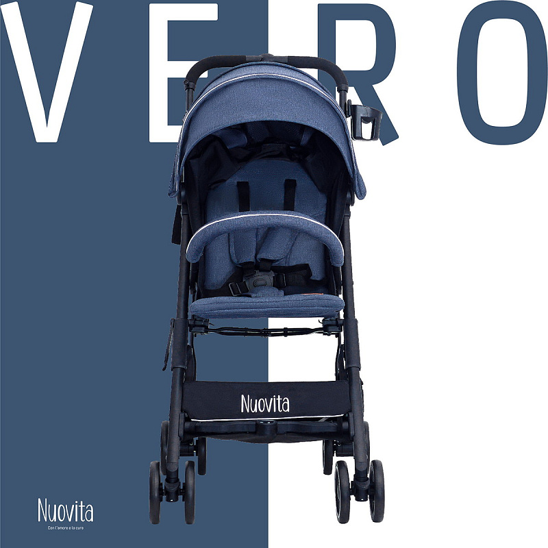 Прогулочная коляска Nuovita Vero — это классическая коляска-книжка с удобным посадочным местом для малыша в возрасте от шести месяцев до 3-х лет. Данная коляска прекрасно подойдет для путешествий на самолете и поезде. Коляску можно взять в ручную кладь, не боясь, что она потеряется или испортится при перевозке в багажном отделении. Модель легко и беспрепятственно проходит в любой лифт. Для надежной фиксации малыша на сидении предусмотрены 5-точечные ремни безопасности с мягкими накладками, межножный ограничитель и защитный съемный бампер с накладкой из текстиля. Коляска имеет удобный капор, который бесшумно регулируется двумя положениями и имеет дополнительный козырек от солнца. Обивка изготовлена из специальной влаго- и ветроустойчивой ткани. Это 300D лен — материал с пропиткой, которая создает защиту от намокания и выцветания, а также легко поддается очистке. Родительская ручка имеет мягкую накладку из поролона. Рама выполнена из алюминия, имеет классическую конструкцию и снабжена двойными колесами с амортизацией. На раме задних колес расположена педаль ножной тормозной системы. Материал покрышек — вспененная резина, что в комплекте с полной амортизацией обеих колесных баз обеспечивает плавный ход даже на ухабистой дороге.