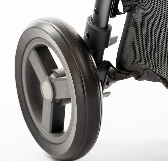Передние поворотные колеса с фиксацией. Оснащены системой «антишок». Система антишок – сложный механизм, обеспечивающий безупречную амортизацию и защищающий ребенка от резких толчков и последующего просыпания. Например, при столкновении коляски с бордюром, она мягко оттолкнется от него и резкого торможения с ощутимым ударом не будет.