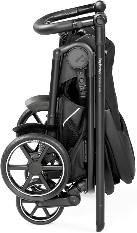 Прогулочная коляска Veloce складывается и раскладывается всего одной рукой с помощью специальной централизованной системы складывания, расположенной на ручке. В сложенном виде занимает очень мало места, и сама стоит без опоры, не пачкая ручку и тканевую обивку.