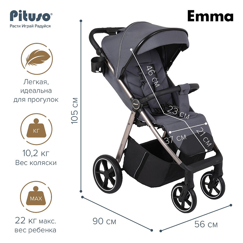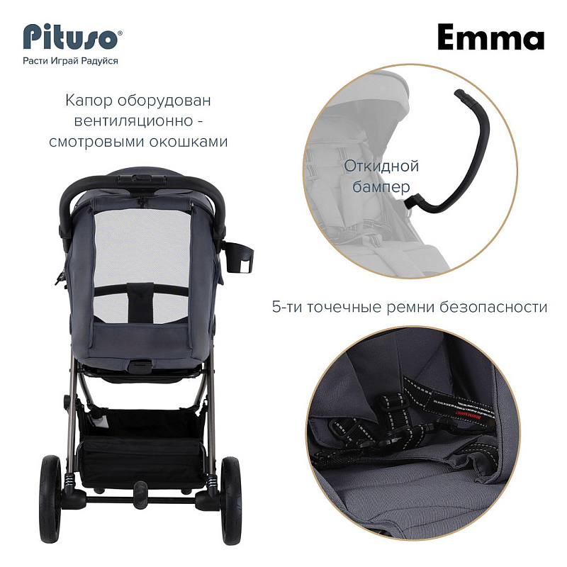 Коляска Pituso Emma идеально подходит для ежедневных прогулок с малышом благодаря своей лёгкости и манёвренности. Регулируемая спинка, включая горизонтальное положение, позволяет ребёнку комфортно спать во время прогулки. Пятиточечные ремни безопасности надёжно фиксируют даже самых подвижных малышей, а большой капюшон защищает от непогоды и палящего солнца.