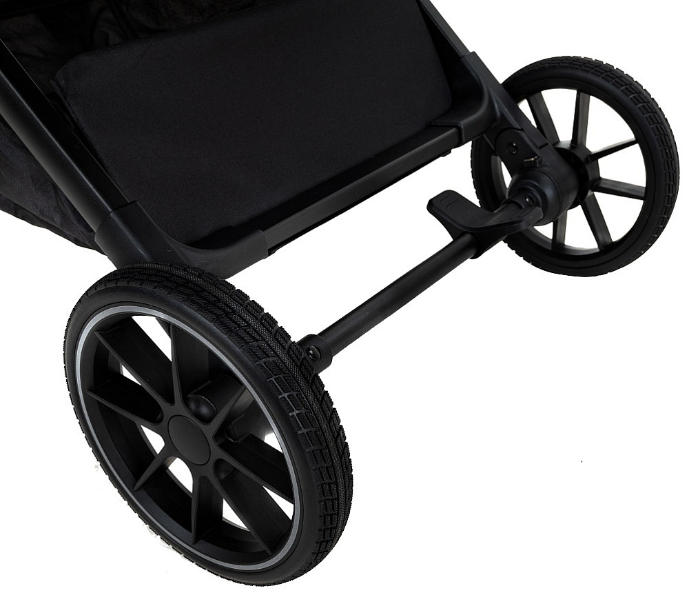Передние колеса легко вращаются вокруг своей оси под углом 360 градусов. Они обеспечивают шасси дополнительную маневренность, значительно облегчая родителям поездку между полками магазинов.