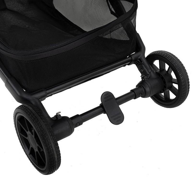 Передние колеса легко вращаются вокруг своей оси под углом 360 градусов. Они обеспечивают шасси дополнительную маневренность, значительно облегчая родителям поездку между полками магазинов.