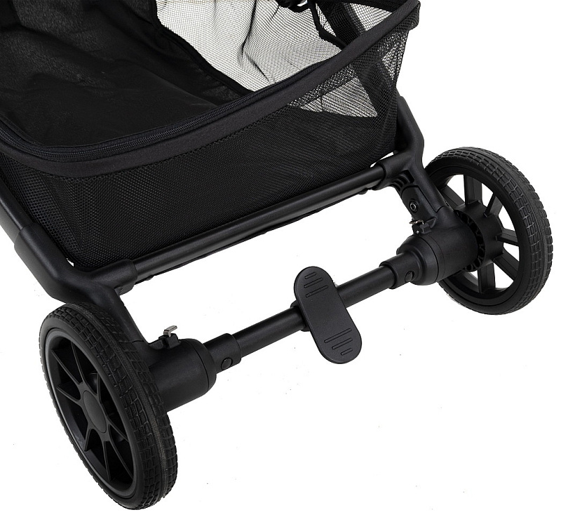 Передние колеса легко вращаются вокруг своей оси под углом 360 градусов. Они обеспечивают шасси дополнительную маневренность, значительно облегчая родителям поездку между полками магазинов.