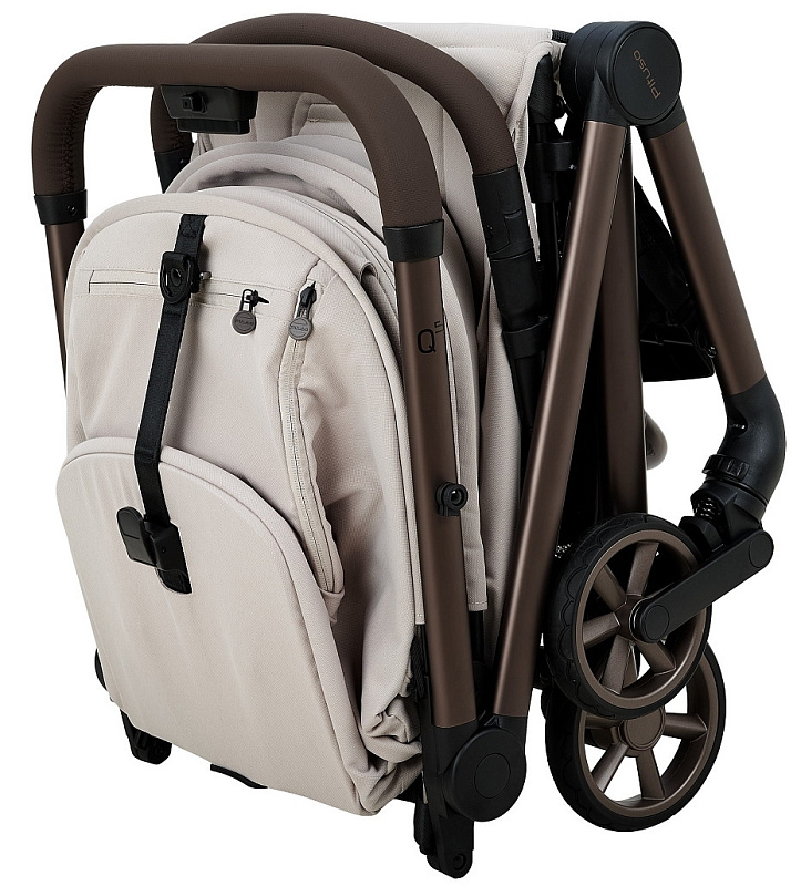 Ультра компактная. Благодаря своему компактному размеру, коляска Q5 удобно транспортируется и в сложенном виде занимает мало места. Складывается одной рукой, в вертикальном положении стоит без опоры, сохраняя чистоту текстиля и ручки. Складной механизм по типу «книжка». Для переноски коляски предусмотрен удобный плечевой ремень.