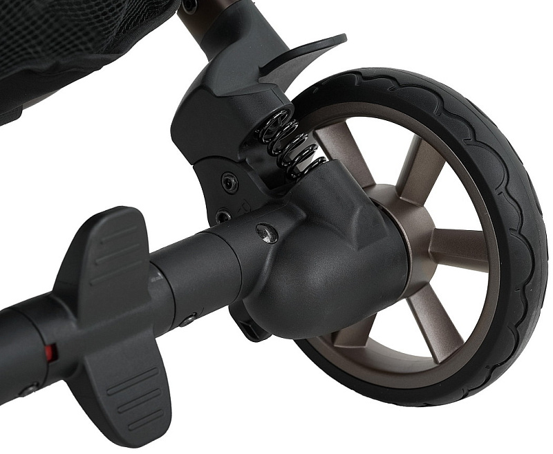 Отличная маневренность и плавность хода. Шасси имеет мягкую подвеску и шариковые подшипники на каждом колесе. Задние колеса диаметром 15 см. Передние колеса диаметром 13см с амортизацией и функцией блокировки.