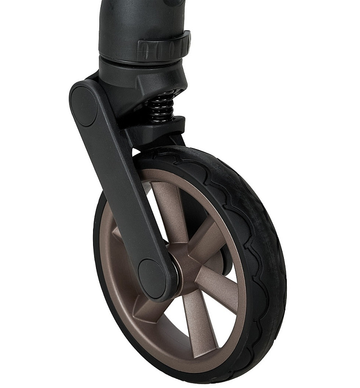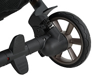 Отличная маневренность и плавность хода. Шасси имеет мягкую подвеску и шариковые подшипники на каждом колесе. Задние колеса диаметром 15 см. Передние колеса диаметром 13см с амортизацией и функцией блокировки.