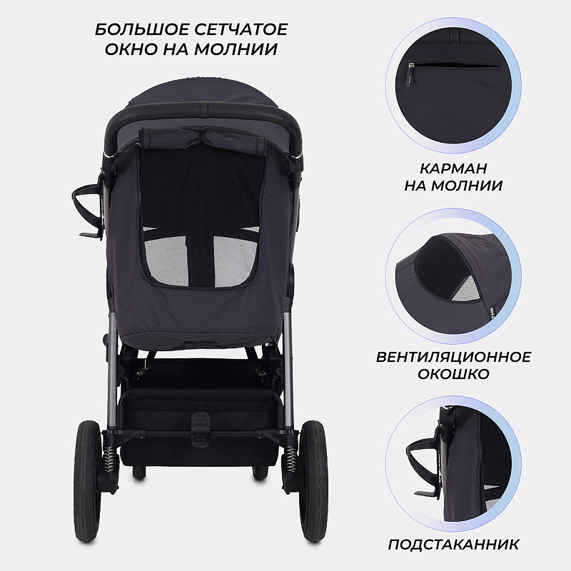 главная инновация модели - бескамерные резиновые колеса, которые не требуют поддува. Благодаря им коляска легко преодолеет сложный ландшафт: сугробы, грязь, песок, гравий…