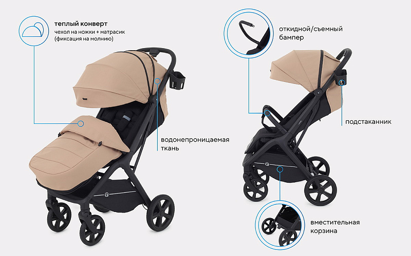 модель абсолютно непродуваема - накидка для ножек (по желанию) фиксируется на съемном матрасике по всему периметру с помощью молнии. Ребенку будет максимально тепло и уютно, как в коконе.