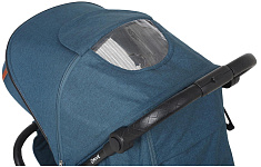 Для комфорта малыша уровень наклона спинки коляски (до лежачего) и положение капюшона (от открытого до глубокого) регулируются плавно и бесшумно в нужное положение. В верхней части капюшона расположена скрытая секция на молнии, увеличивающая капюшон до бампера. Дополнительный козырёк защищает от солнечных лучей. Специально, для прогулок в жаркие дни, в изголовье имеется вентиляционное окно, защищённое москитной сеткой и для удобства открывающееся с двух сторон двумя молниями. В открывающей секции вшит объёмный карман для телефона, ключей и др. предметов. В верхней части капюшона для зрительного контакта с малышом, расположено дополнительное смотровое сетчатое окошко с защитной плёнкой, фиксируемое на скрытый магнит. Нижняя часть подножки защищена эко кожей.