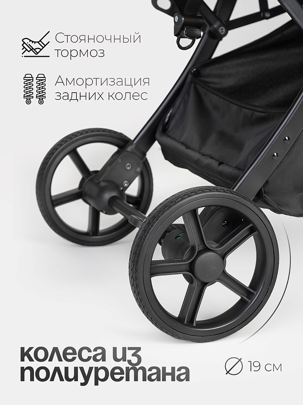 Коляска имеет мягкий ход благодаря встроенной амортизации передних и задних колес, а также материалу колес (PU пена).