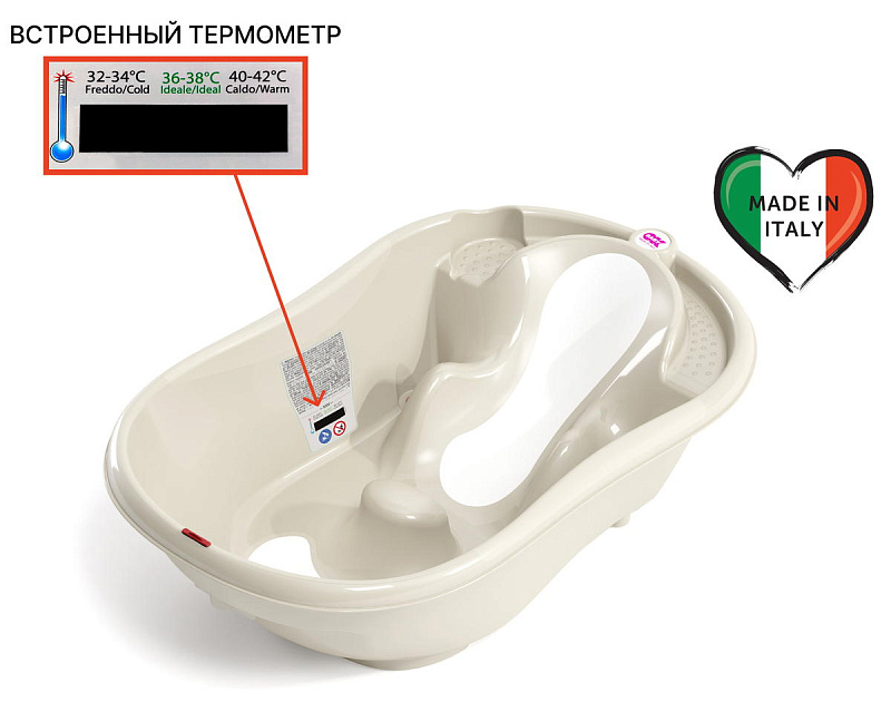 По бокам расположены рельефные нескользящие подставки для мыла или мочалки, также ванночка оборудована удобным встроенным термометром и специальным сливом.