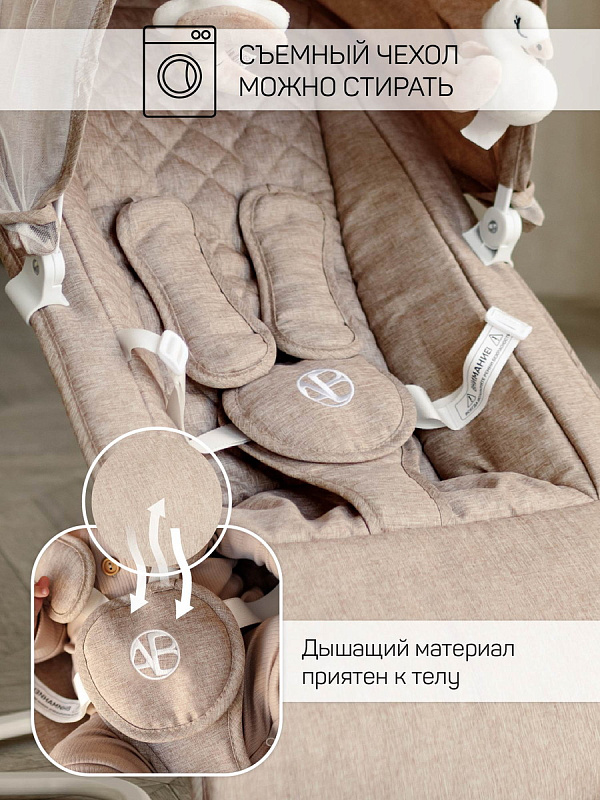 Электрокачели для новорожденных с пультом оснащены очаровательными мягкими игрушками, которые закреплены на капюшоне в непосредственной близости от ребенка. Это стимулирует развитие мелкой моторики рук и обеспечивает дополнительное развлечение для малыша.