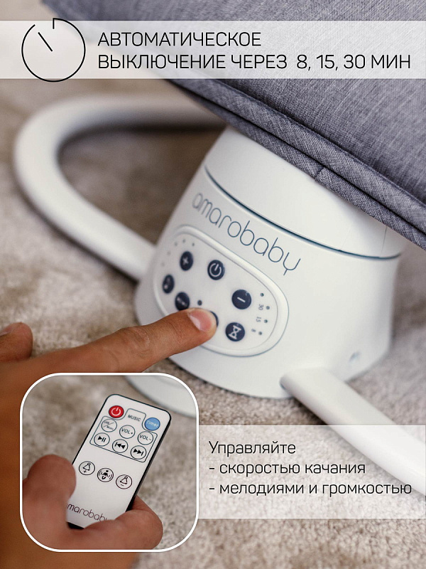 Электрокачели Amarobaby имеют функцию автоматического отключения через 8, 15 или 30 мин. Важно помнить о правильном уходе за качелями. Все элементы легко чистятся с помощью влажной мягкой ткани или губки с мягким моющим средством. Съемный чехол сиденья можно стирать при температуре воды не выше 30 °C.