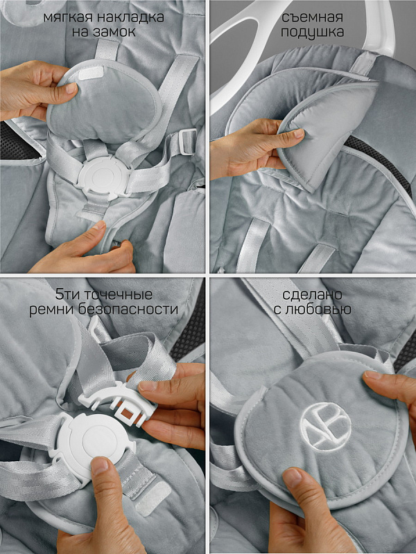 Ремни безопасности надежно удерживают ребенка в качелях.