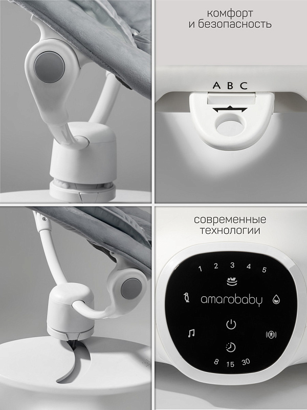 Электронные качели для малышей Amarobaby Smart swing - это удачное решение для заботливых мам. Широкий спектр функций позволит вашему малышу комфортно и безопасно проводить время, пока вы сможете заняться домашними делами или просто отдохнуть. 12 встроенных мелодий, а также функция воспроизведения через USB и Bluetooth позволит вам легко подобрать необходимую мелодию или аудиокнигу для вашего малыша. Ремни безопасности надежно удерживают ребенка в качелях, обеспечивая ему безопасность и при этом не создают дискомфорт. Мягкий плюшевый материал будет приятен для тела, а сетчатая секция предотвратит перегревание в жаркую погоду. Также в комплекте идет теплый матрасик. С помощью пульта ДУ, который идет в комплекте, вы легко сможете управлять функциями электрокачели на расстоянии. 3 разных типа качания с механическим переключателем и 5 встроенных скоростей позволят подобрать оптимальную комбинацию для вашего ребенка. Электрокачели для новорожденных могут быть подключены, как к сети, так и через элементы питания (4*АА). Таким образом, вы можете использовать качели даже в отсутствие электричества или в поездках. Качели Amarobaby имеют функцию автоматического отключения по таймеру через 8, 15 или 30 мин. Стильный дизайн, многофункциональность, надежность и безопасность делают качели Amarobaby Smart swing отличным выбором для вас и вашего ребенка.