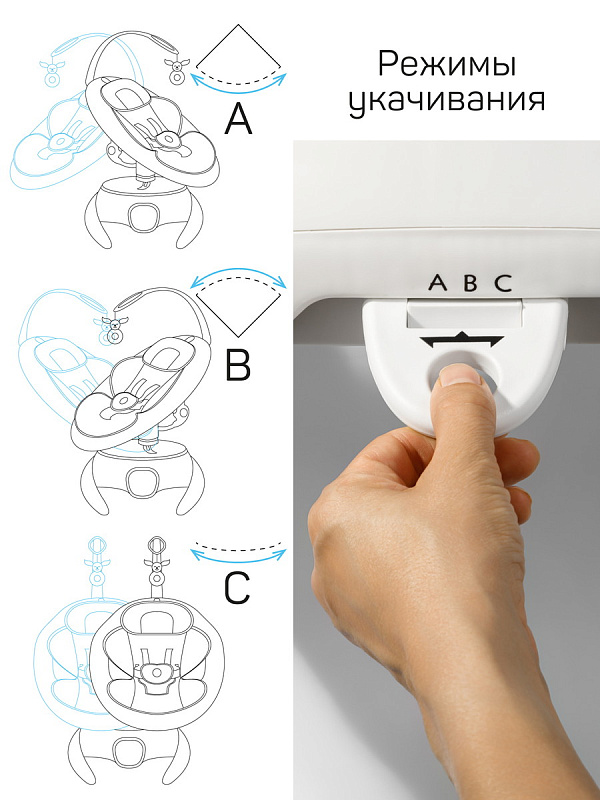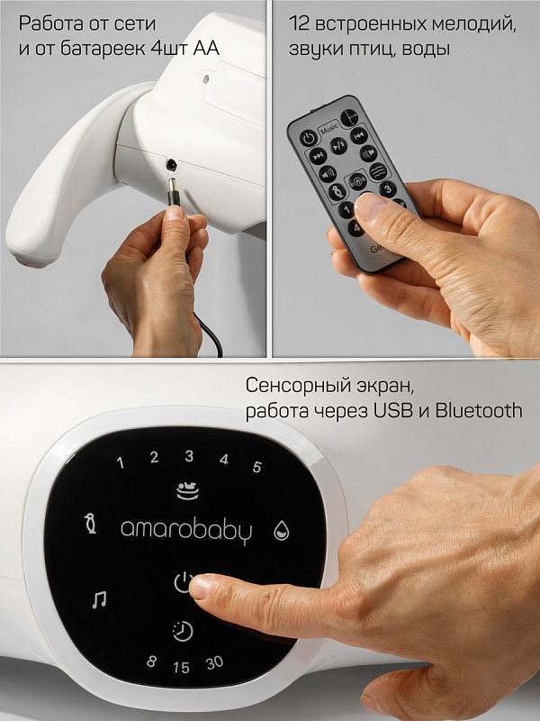 Электронные качели для малышей Amarobaby Smart swing - это удачное решение для заботливых мам. Широкий спектр функций позволит вашему малышу комфортно и безопасно проводить время, пока вы сможете заняться домашними делами или просто отдохнуть. 12 встроенных мелодий, а также функция воспроизведения через USB и Bluetooth позволит вам легко подобрать необходимую мелодию или аудиокнигу для вашего малыша. Ремни безопасности надежно удерживают ребенка в качелях, обеспечивая ему безопасность и при этом не создают дискомфорт. Мягкий плюшевый материал будет приятен для тела, а сетчатая секция предотвратит перегревание в жаркую погоду. Также в комплекте идет теплый матрасик. С помощью пульта ДУ, который идет в комплекте, вы легко сможете управлять функциями электрокачели на расстоянии. 3 разных типа качания с механическим переключателем и 5 встроенных скоростей позволят подобрать оптимальную комбинацию для вашего ребенка. Электрокачели для новорожденных могут быть подключены, как к сети, так и через элементы питания (4*АА). Таким образом, вы можете использовать качели даже в отсутствие электричества или в поездках. Качели Amarobaby имеют функцию автоматического отключения по таймеру через 8, 15 или 30 мин. Стильный дизайн, многофункциональность, надежность и безопасность делают качели Amarobaby Smart swing отличным выбором для вас и вашего ребенка.
