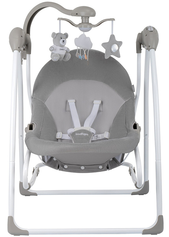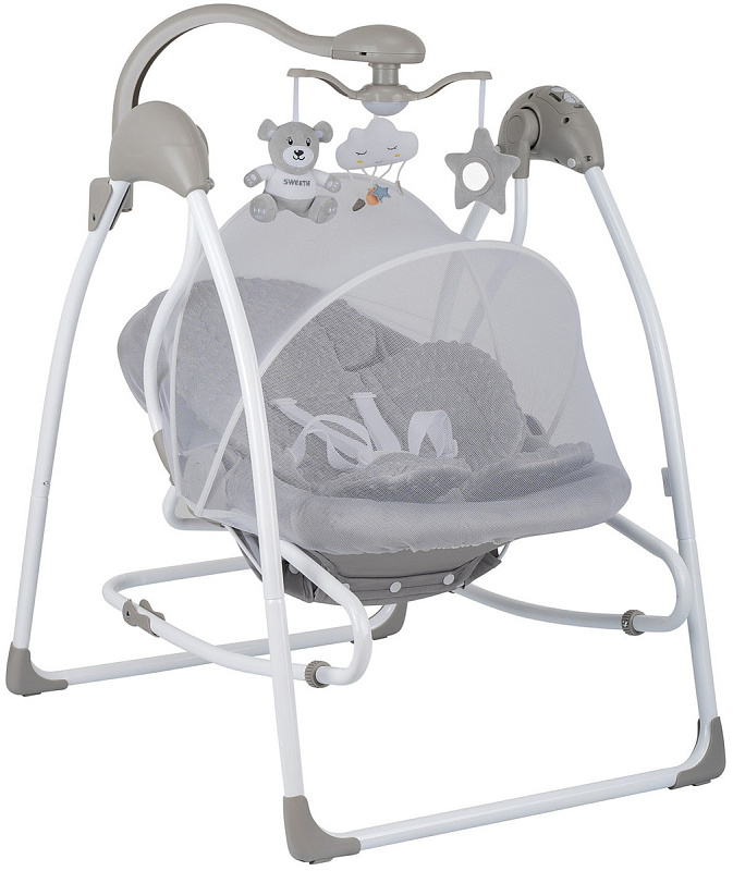 Родителям будет удобно управлять качелями с пульта дистанционного управления - регулировать скорость, включать мелодии или звуки природы, увеличивать или уменьшать громкость музыки, если малыш засыпает. На электронном мобиле со светом 3 съемные мягкие игрушки, которые обязательно заинтересуют ребенка.