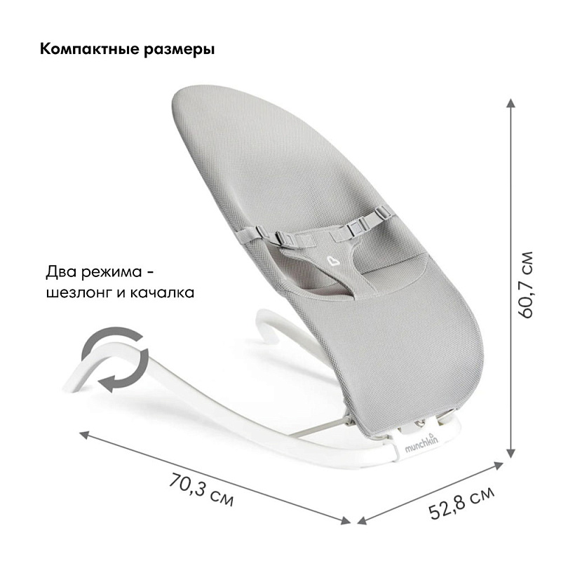 Шезлонг-качалка от бренда Munchkin - настоящая находка для родителей. Нежные покачивания создают успокаивающую и расслабляющую атмосферу для ребенка. Можно использовать с самого рождения до достижения веса 9 кг. Нет ничего проще, чем использование этой модели - просто вращайте ножки, чтобы перевести ее в режим шезлонга или в режим качалки.