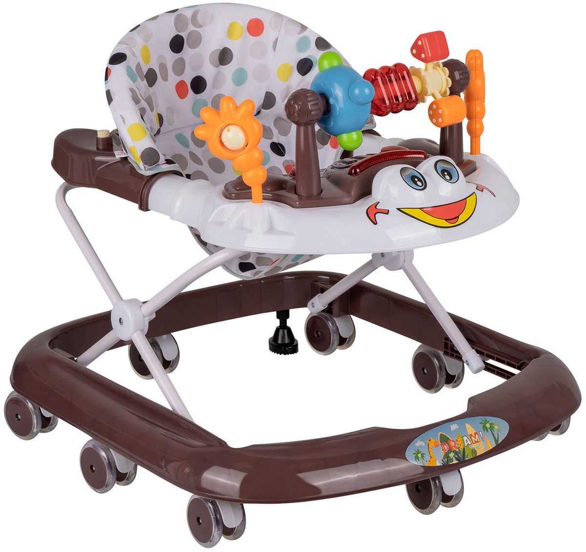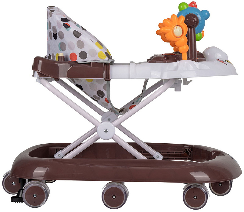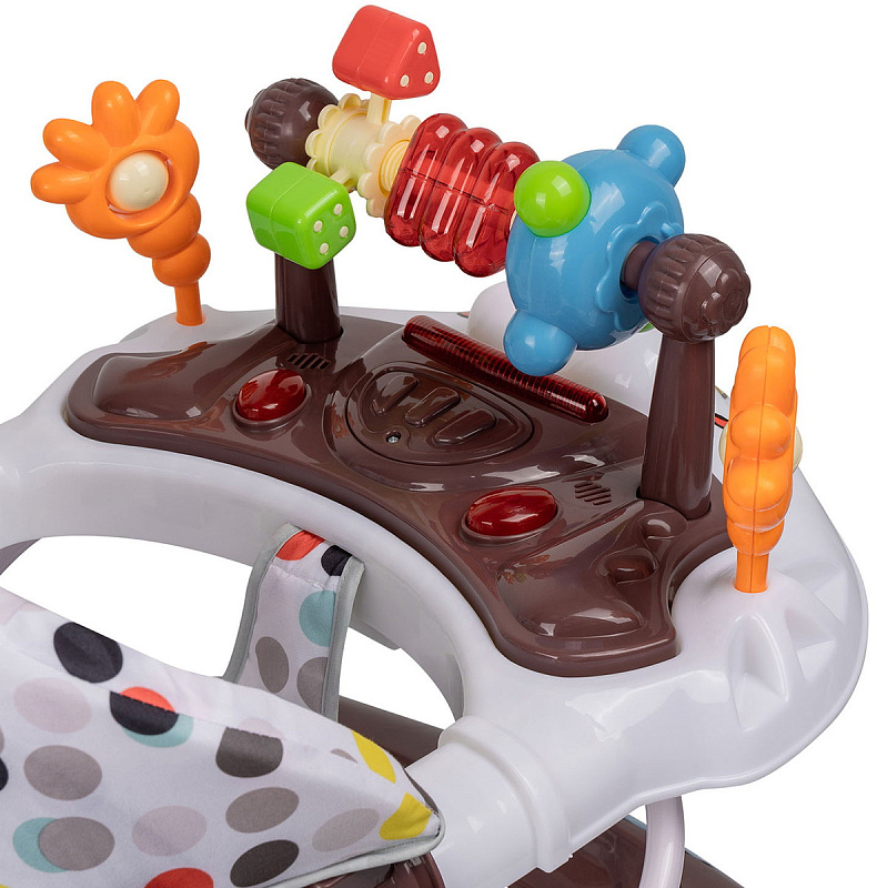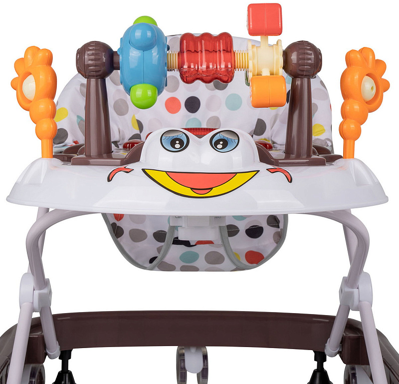Яркая модель понравится каждому малышу! Съемная панель оснащена увлекательными игрушками дополненными музыкальным сопровождением и световыми эффектами. Сидение регулируется в трех положениях по мере роста ребенка. Восемь силиконовых колес расположенных по периметру базы обеспечивают прочность и маневренность конструкции, при необходимости их можно поставить на тормоз. Легкую и компактную модель удобно хранить в сложенном виде - не занимает много места.