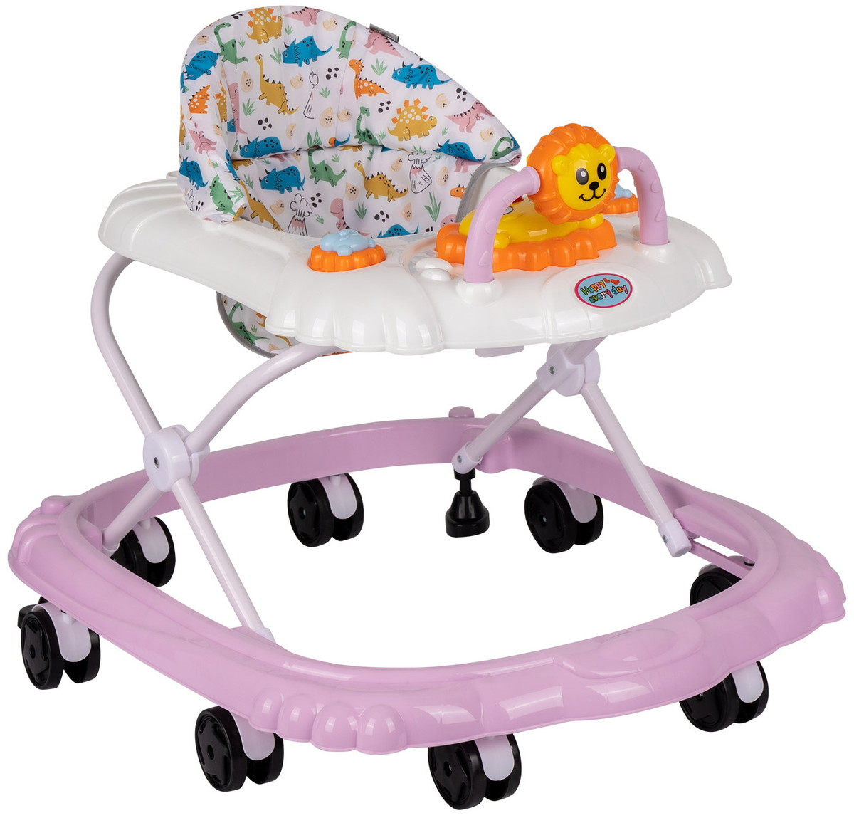 Яркая модель понравится каждому малышу! Съемная панель оснащена увлекательными игрушками с музыкальным сопровождением. Сидение регулируется в трех положениях по мере роста ребенка. Восемь колес расположенных по периметру базы обеспечивают прочность и маневренность конструкции, при необходимости их можно поставить на тормоз. Легкую и компактную модель удобно хранить в сложенном виде - не занимает много места.