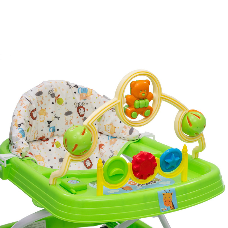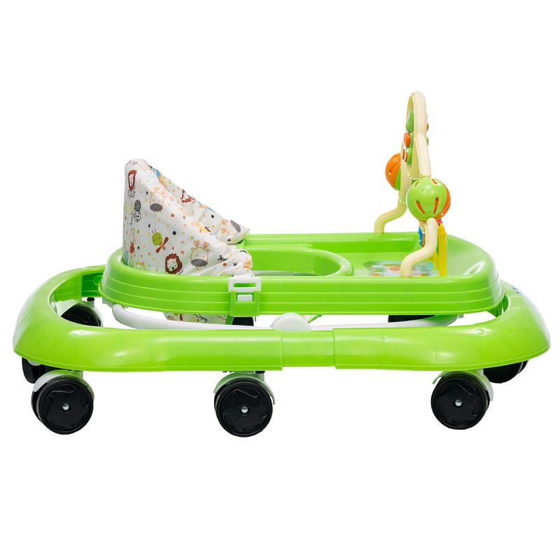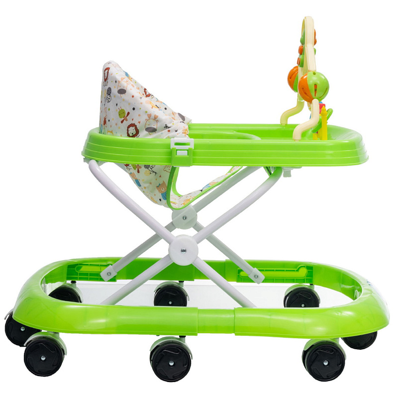 Ходунки в оригинальном ярком дизайне с игровой панелью дополненной приятной мелодией. Погремушки выполнены в оригинальной форме, которые помогут в развитии мелкой моторики малыша. Сидение регулируется в четырех положениях, которые можно менять по мере роста ребенка. Восемь колес расположенных по периметру базы обеспечивают прочность и маневренность конструкции. Ходунки компактного размера и легко складываются, поэтому не занимают много места при хранении.