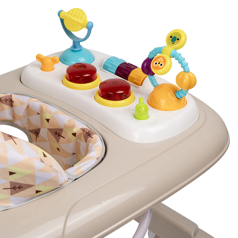 Музыкальная игровая панель со световыми эффектами и 12 мелодиями превращает ходунки в полноценную развивающую зону. Большой набор интерактивных элементов стимулирует интерес ребенка и способствует развитию моторики. Панель съемная, что упрощает уход и расширяет варианты использования модели.