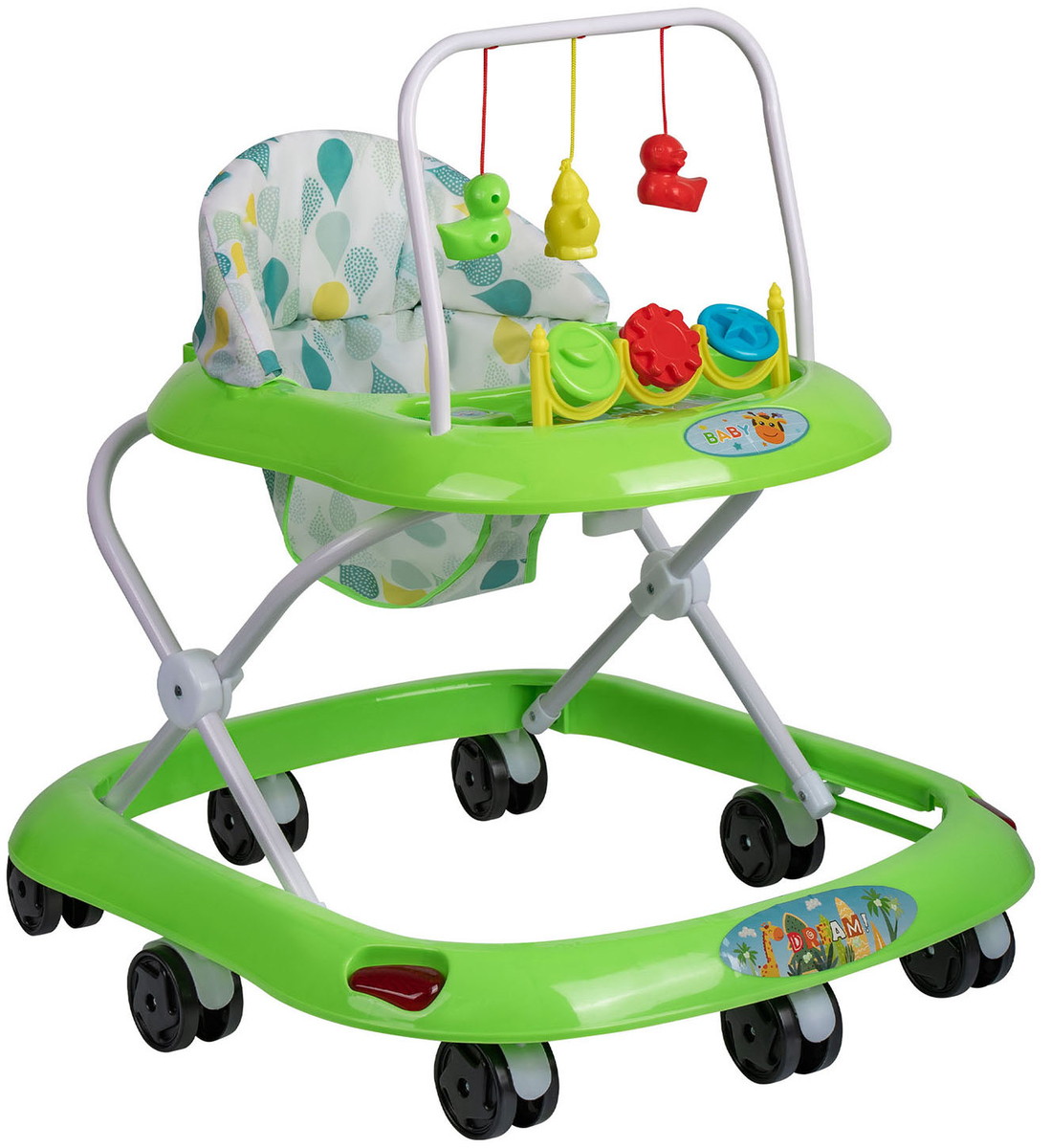 Детские ходунки INDIGO «Весело шагать» — это лёгкая и функциональная модель для малышей, которые начинают делать первые шаги. Конструкция на 8 пластиковых колёсах обеспечивает устойчивость и лёгкость движения по ровной поверхности. Три уровня регулировки по высоте позволяют настроить ходунки под рост ребёнка, обеспечивая комфортное положение при ходьбе. Мягкое сиденье со спинкой высотой 30 см создаёт удобную опору для малыша, а подвесные элементы и музыкальный телефончик превращают обучение ходьбе в интересное и познавательное занятие. Батарейка для телефончика включена в комплект.