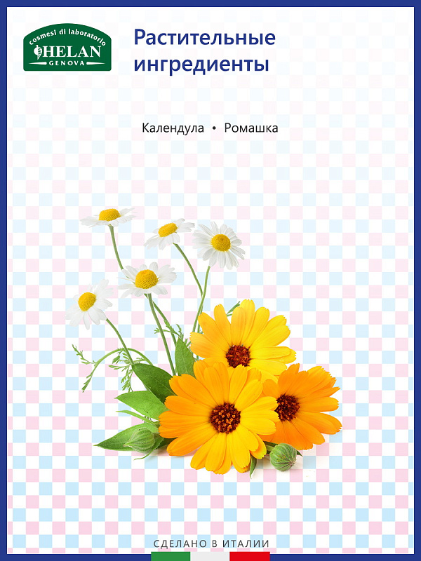 Экстракты из цветков ромашки и лекарственной календулы образуют активный растительный комплекс, обладающий сильными успокаивающими и увлажняющими свойствами.