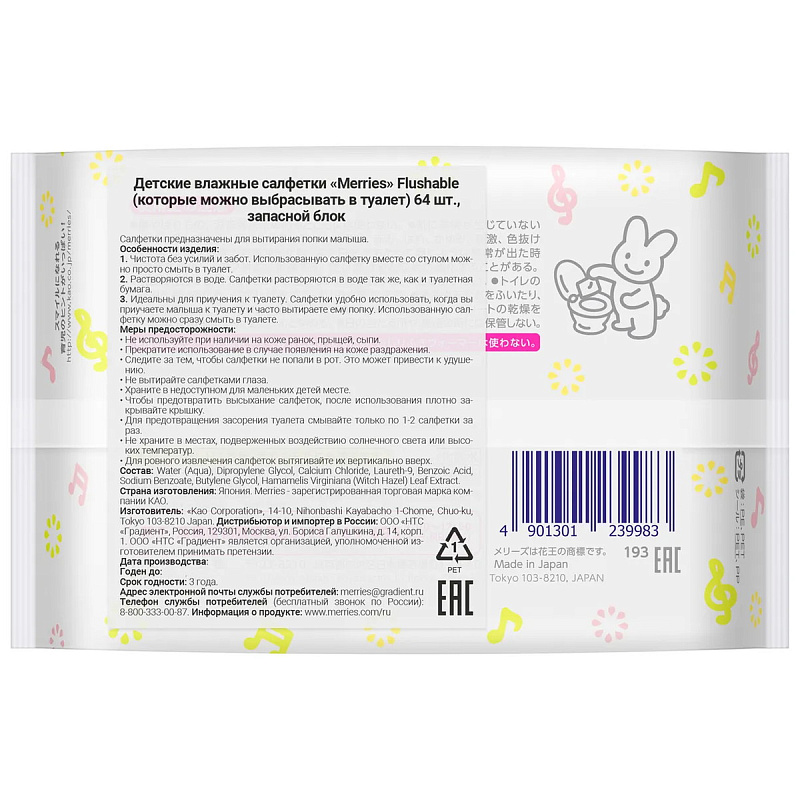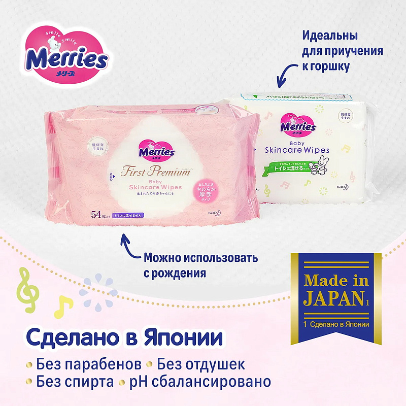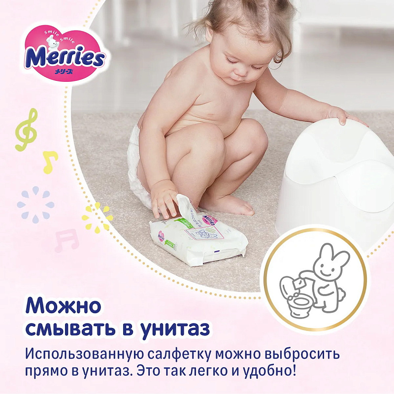 Детские влажные салфетки Merries Flushable 64 шт. запасной блок 194840 New