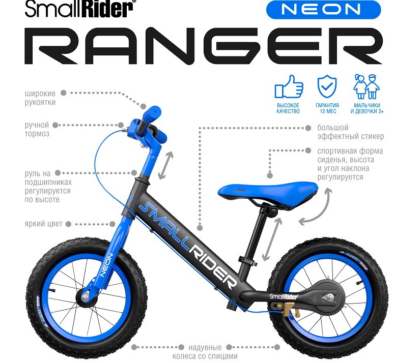 Беговел позволит Вашему ребенку развить в себе необходимые навыки - чувство равновесия и ощущения баланса. Большие и вездеходные надувные колеса отлично амортизируют и преодолеют различные поверхности. Ручной тормоз с удобным плоским курком позволит, помимо торможения ногами, лучше контролировать скорость. Кстати, в комплекте идет еще дополнительная рукоятка тормоза для монтажа под левшей. Руль и сиденье не только имеют возможность регулировки высоты под габариты ребенка, но также и наделены способностью менять угол наклона. Яркий и потрясающе выглядящий, беговел Рейнджер Неон станет отличным и любимым транспортом для Вашего малыша.