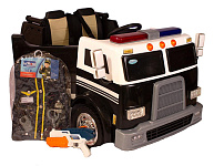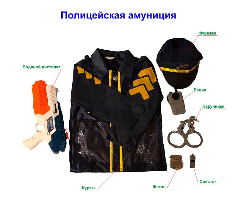 Набор полицейского: фуражка и куртка полицейского с жетоном, рация, водяной пистолет, наручники, свисток.