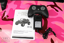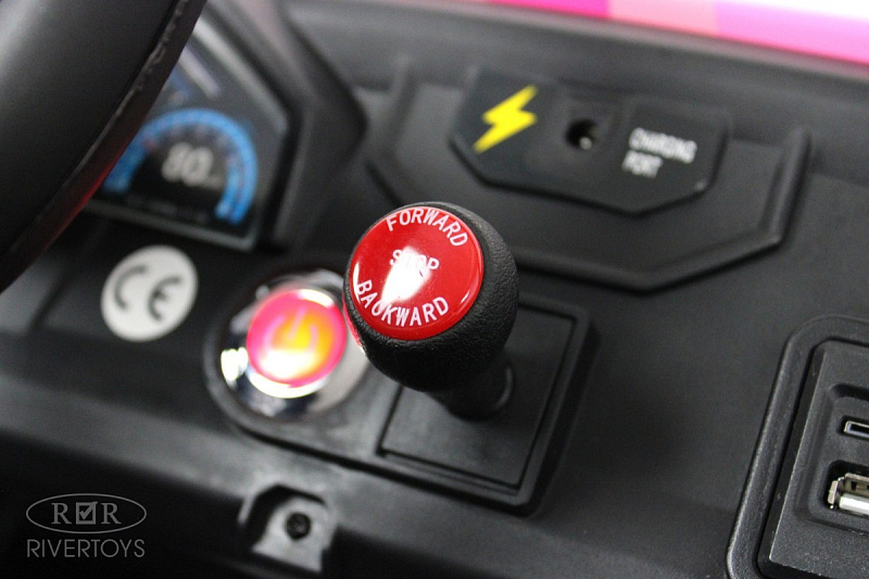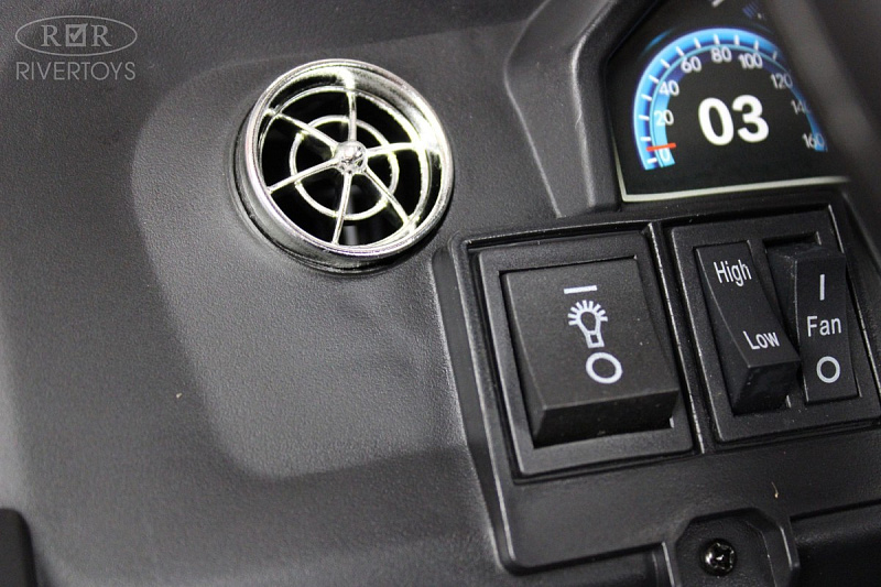 Включение электромобиля осуществляется с помощью кнопки, а кнопка переключения между пультом и педалями добавляет удобства в использовании. Кондиционер, который включается отдельной кнопкой, сделает поездку максимально комфортной.