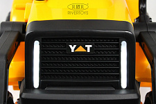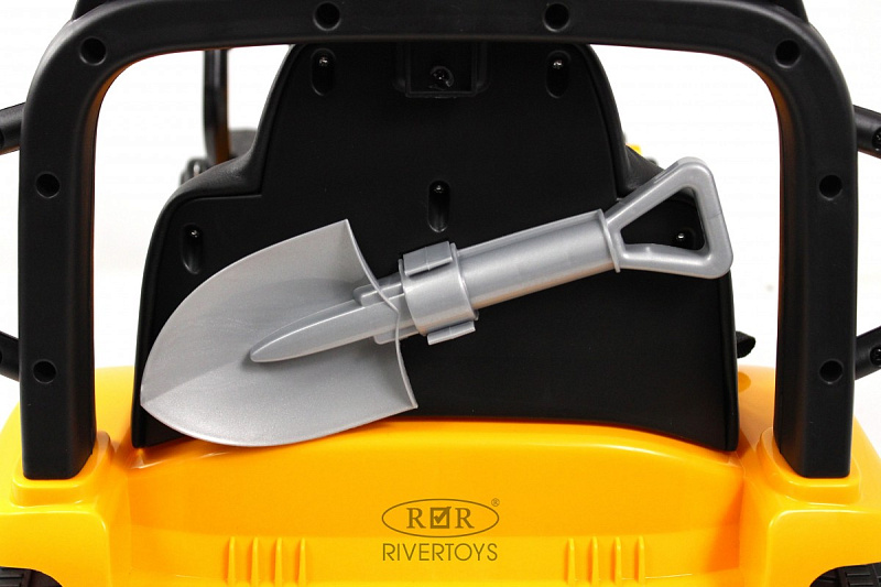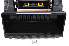 Колёса выполнены из пластика. Сиденье обито эко-кожей, есть полосной ремень безопасности. В комплекте идёт ковш-короб с механическим подъёмом и лопатка.