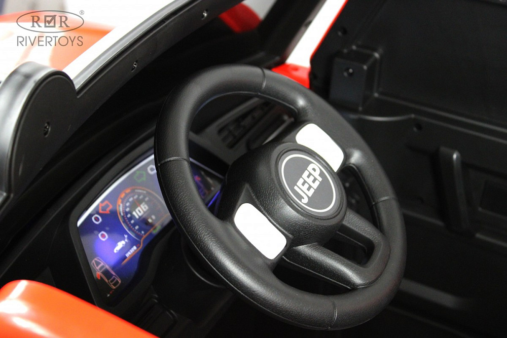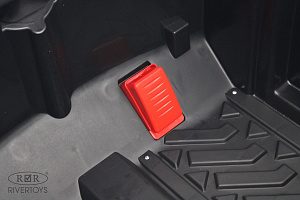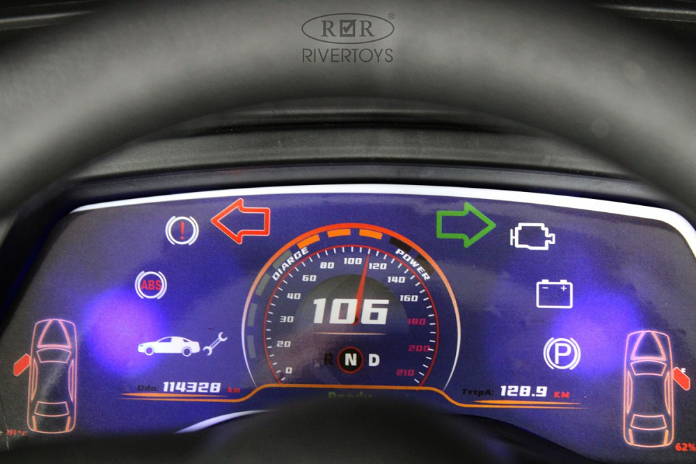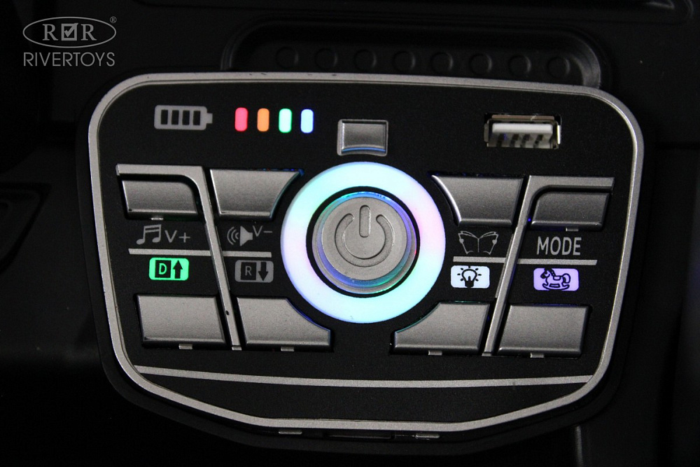 Включение осуществляется с помощью кнопки, а скорость регулируется — вперёд и назад, высокая и низкая. Медиа-панель оснащена USB-входом, Bluetooth, AUX и индикатором заряда батареи, что позволяет легко подключать различные устройства и следить за уровнем заряда аккумулятора.