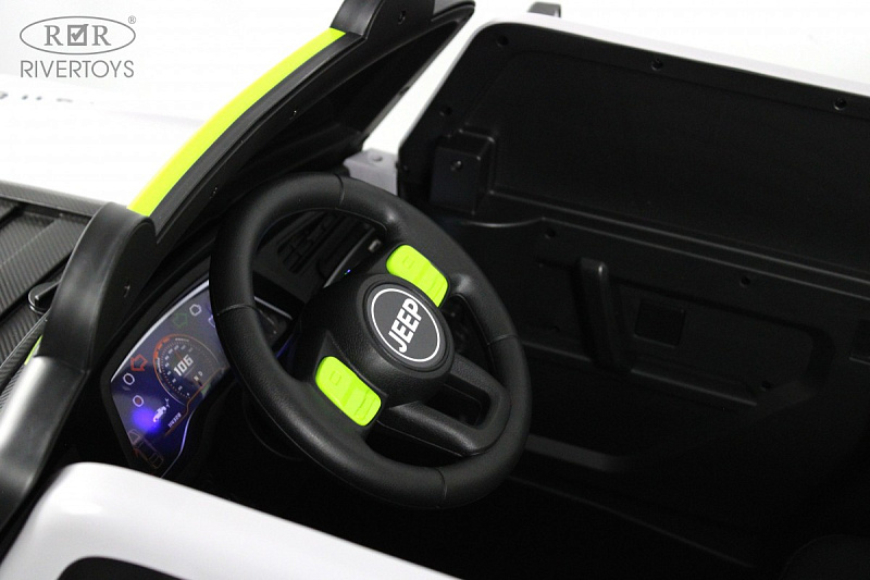 Включение осуществляется с помощью кнопки, а скорость регулируется — вперёд и назад, высокая и низкая. Медиа-панель оснащена USB-входом, Bluetooth, AUX и индикатором заряда батареи, что позволяет легко подключать различные устройства и следить за уровнем заряда аккумулятора.