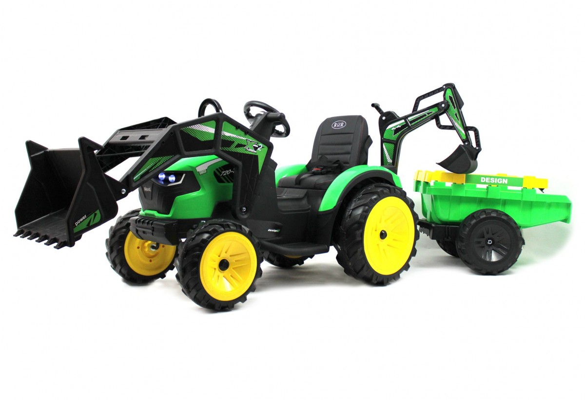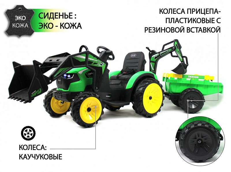 Уникальная детская машинка с своем классе. Трактор оснащенный 2мя ковшами и тележкой. Поворотное кресло для удобства управления погрузочным ковшом позволяет развернуть положение на 180 градусов. Детский трактор выполнен из плотного ударопрочного пластика, колеса резина ЕВА и пультом управления. Такая модель приведет в восторг любого любителя техники, игры на свежем воздухе в кругу друзей надолго запомнятся Вашему малышу как моменты счастливого детства.
