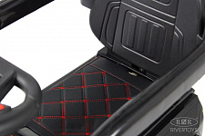 Сиденье из эко-кожи со спинкой из пластика обеспечивает комфорт во время катания. Включить электромобиль можно с помощью кнопки, а медиа-панель с Bluetooth, индикатором заряда батареи и USB-входом делает использование ещё более удобным. Откидная крыша, подножка и боковые фиксаторы безопасности обеспечивают дополнительную безопасность во время езды.