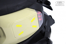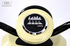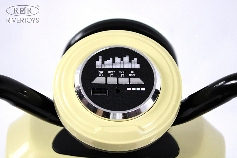 Включение осуществляется кнопкой или движением ноги, что делает использование электромобиля ещё более удобным. На медиа-панели расположены разъёмы USB, AUX и Bluetooth, а также индикатор заряда батареи, что позволяет легко заряжать электромобиль и контролировать уровень заряда аккумулятора.