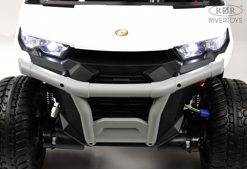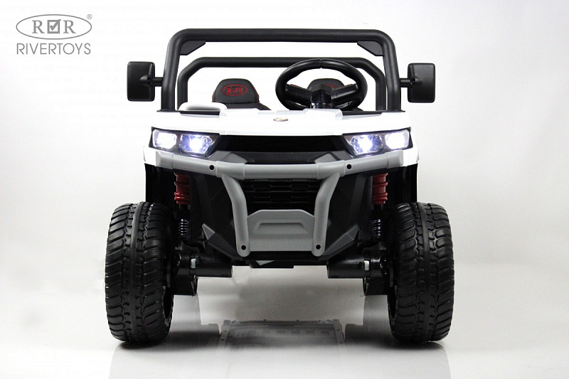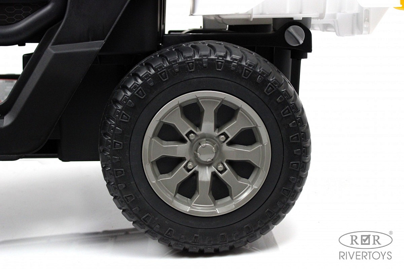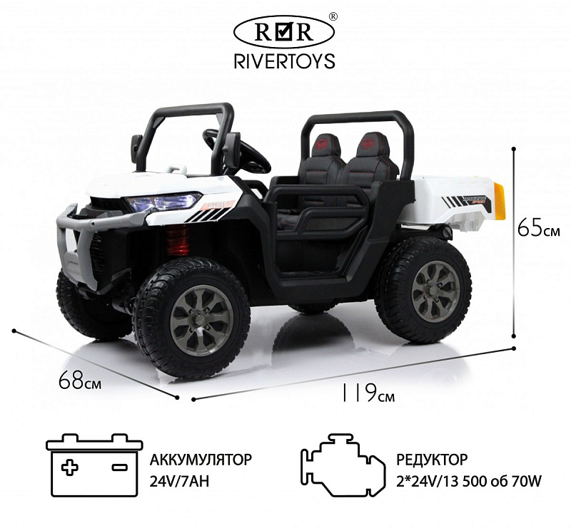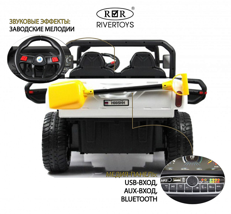 Грузовик RiverToys H005HH обладает повышенной проходимостью, он работает на 24 вольтовым аккумуляторе и четырёх моторах, ребёнку будет интересно на нём кататься, так как он сможет добраться на данном грузовике в те места, куда не проедет обычный электромобиль. Легко преодолевает небольшие бордюры, подъёмы в горку, неровный грунт. С помощью пульта управления родители всегда могут ограничить движение электромобиля, остановить его, если ребёнок при самостоятельном управлении, поехал не в ту сторону. Для комфортной поездки для ребенка автомобиль оборудован мягким сиденьем.