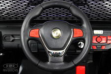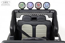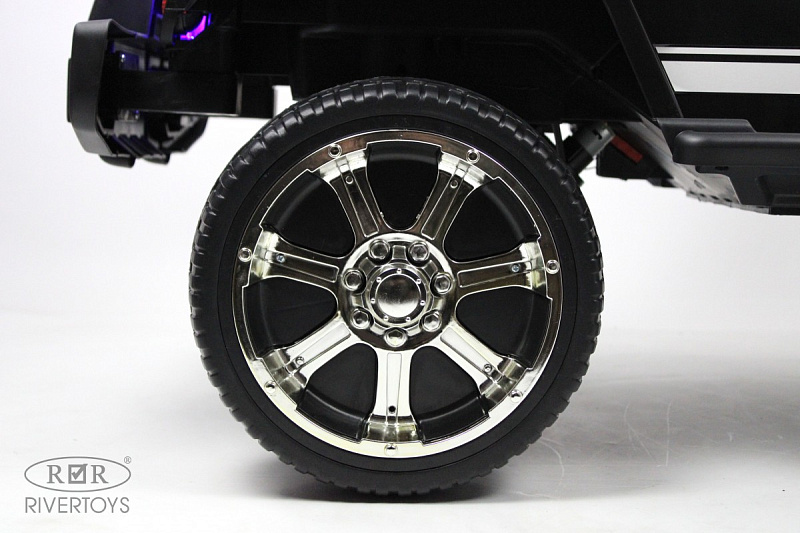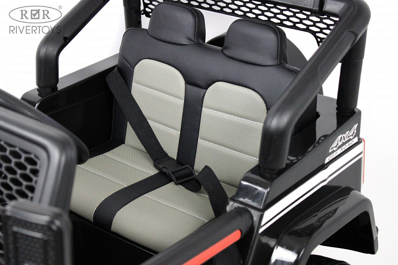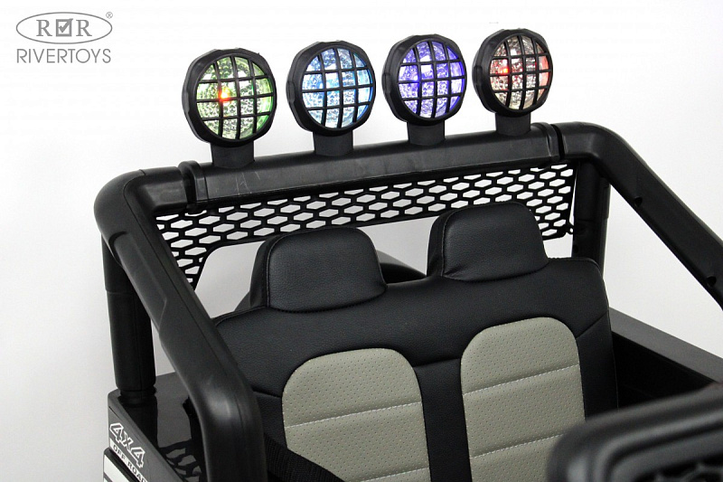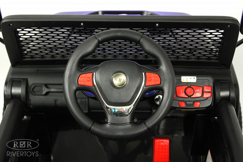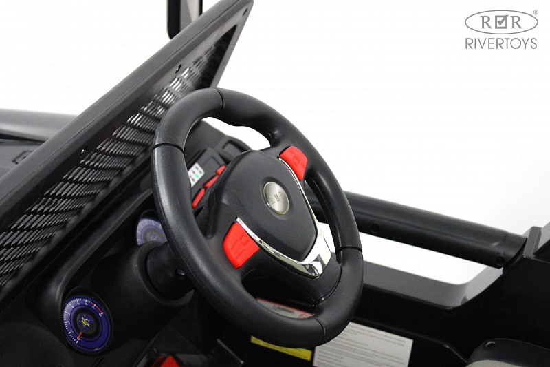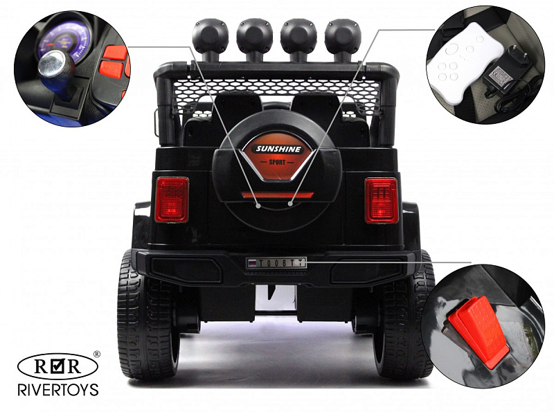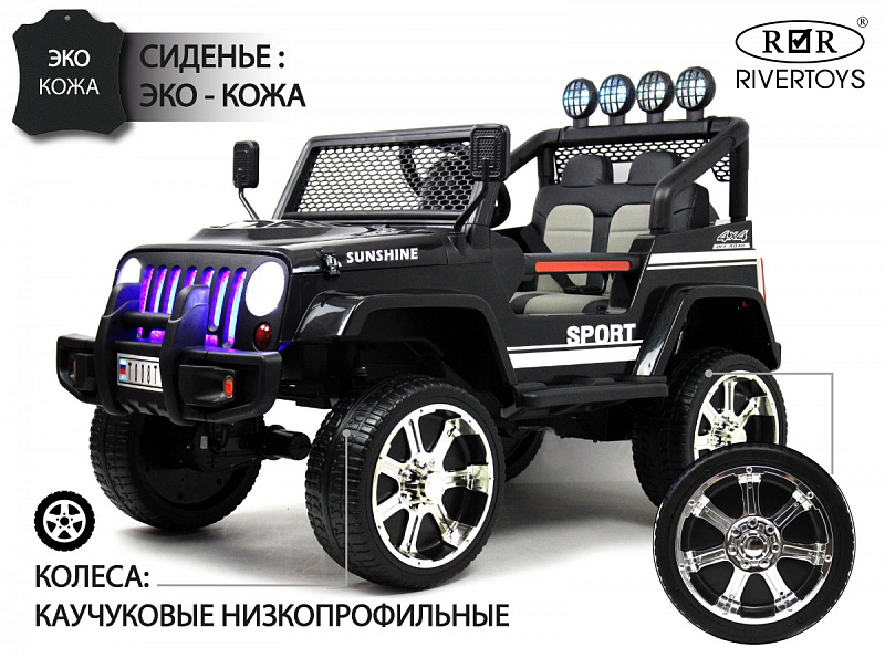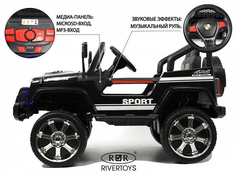 - Большие резиновые колеса наделяют модель RiverToys Jeep высокой проходимостью.