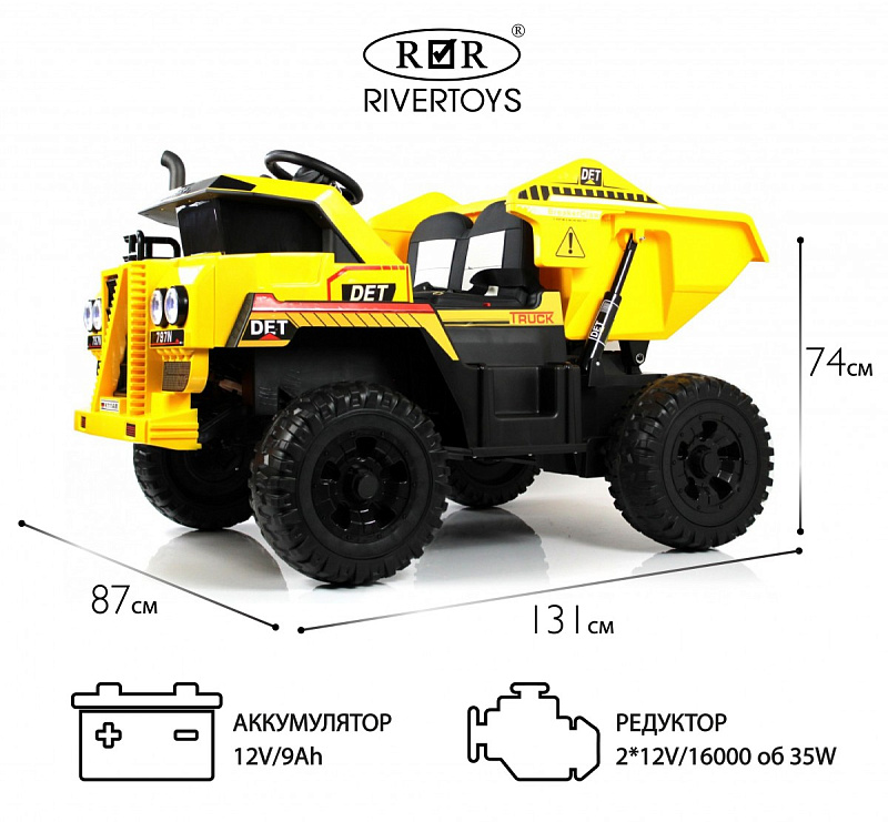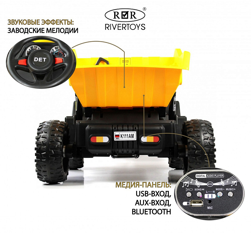 Уникальный мощный и эффектный внушительный грузовик самосвал K111AM. Модель детской машинки имеет габаритный размер и отлично разместит одного или двух малышей в кабине. Полный привод позволит подъезжать к самым труднодоступным местам для погрузки и разгрузки. Модель самосвал K111AM так же не уступает в комфорте спорткарам и кроссоверам. Кресло из Эко кожи, колеса резина, музыка и подсветка фар установлены в этом грузовике. Ремни безопасности и пульт управления позволят родителям спокойно проконтролировать катание даже самых маленьких водителей.