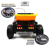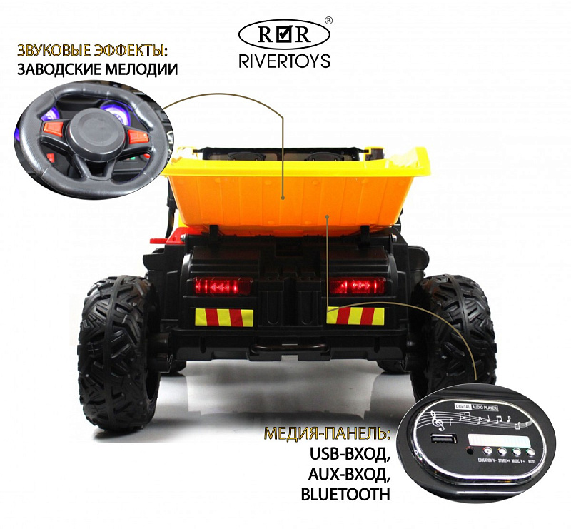 Кузов автомобиля управляется электронным рычагом, позволяя поднимать и опускать его по необходимости. Комплект поставки включает в себя лопату, чтобы ребенок мог играть в песочнице. Медиа-панель электромобиля оснащена USB-входом и AUX-входом, что позволяет вашему ребенку слушать любимую музыку во время езды. Индикатор заряда батареи помогает контролировать уровень заряда.