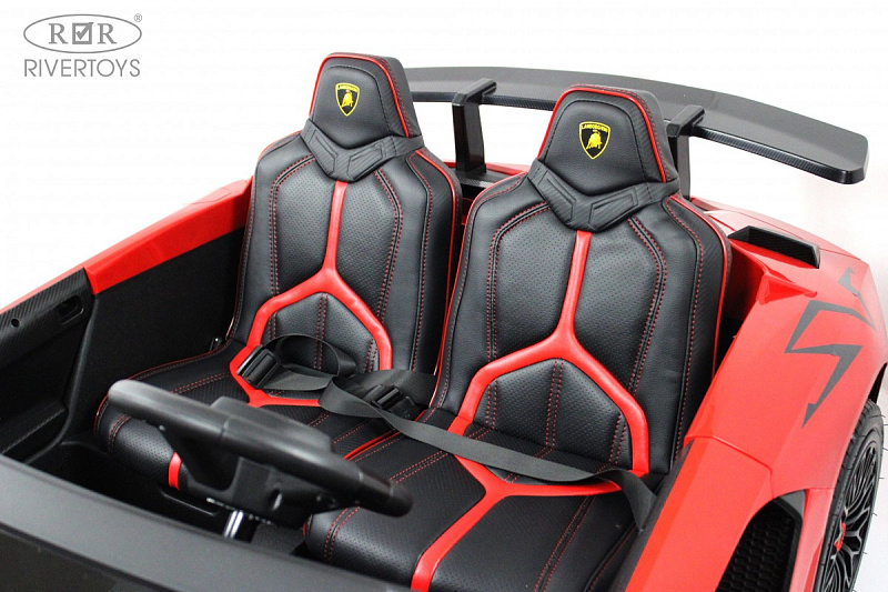 Перед вами один из самых мощных детских электромобилей, представляющий собой лицензионную копию Lamborghini Aventador SV. Транспорт рассчитан на 2-х пассажиров. Для них предусмотрены 2 сиденья, обтянутых кожей алькантарой, каждое с индивидуальной регулировкой. Есть 2 отдельных полосных ремня безопасности, фиксируемых сбоку.