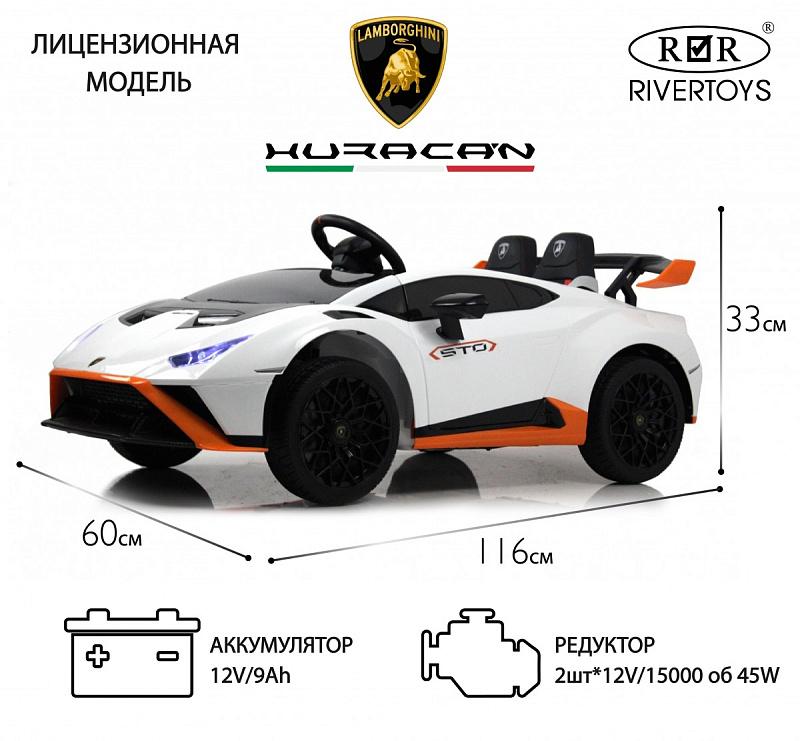Для вашего ребенка только самое лучшее! Представляем детский электромобиль Lamborghini Huracan STO от RiverToys. Этот невероятно стильный и мощный автомобиль станет настоящим сокровищем в коллекции вашего малыша. Lamborghini Huracan STO – это самая популярная модель электромобиля, созданная специально для детей. Он воссоздает все особенности настоящего Lamborghini: грациозные линии, роскошный интерьер и мощный двигатель. Ребенок будет чувствовать себя настоящим гонщиком!