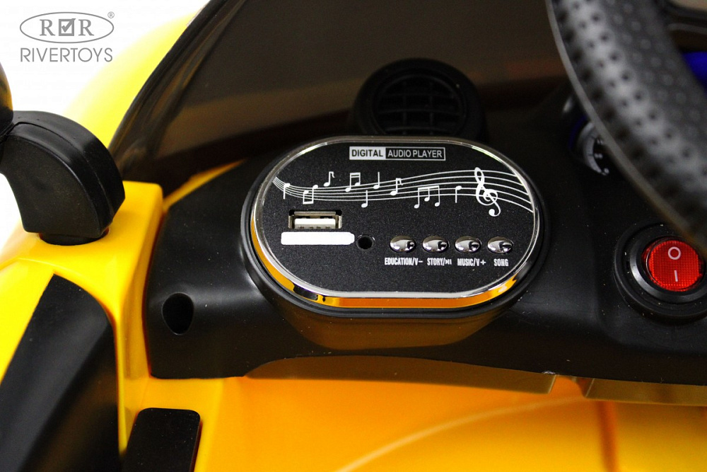 Этот электромобиль оснащён световыми и звуковыми эффектами, которые сделают поездку ещё более увлекательной. Передние и задние фары включаются отдельной кнопкой на панели, а музыкальный руль издаёт звук клаксона и проигрывает заводские мелодии.