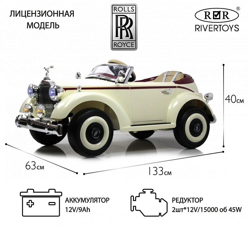 Rolls-Royce E444EE с дистанционным - уникальный ретро электромобиль в своем классе. Фантастический дизайн 50х-60х годов покорит любого автолюбителя даже с самым изысканным вкусом. Абсолютно реалистичный дизайн и невероятные расцветки кузова модели приведут Вас и Вашего малыша в полный восторг. Электромобиль оснащен комфортным салоном с сиденьем из Эко кожи и ремнем безопасности. В модели установлено очень много освещения, подсветка дверей, фары и панель, так же исключительной особенностью Rolls-Royce (E444EE) являются встроенные поворотники. Малыш может сам включать поворотные огни и соблюдать все правила движения). Из дополнительных особенностей салона модель имеет открывающийся задний багажник и фирменные коврики в салон.